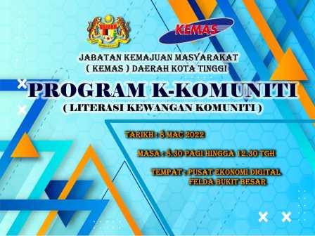 PROGRAM K-KOMUNITI (LITERASI KEWANGAN KOMUNITI) TARIKH : 5 MAC 2022 MASA : 8:30a.m-12:30p.m TEMPAT : PUSAT EKONOMI DIGITAL FELDA BUKIT BESAR