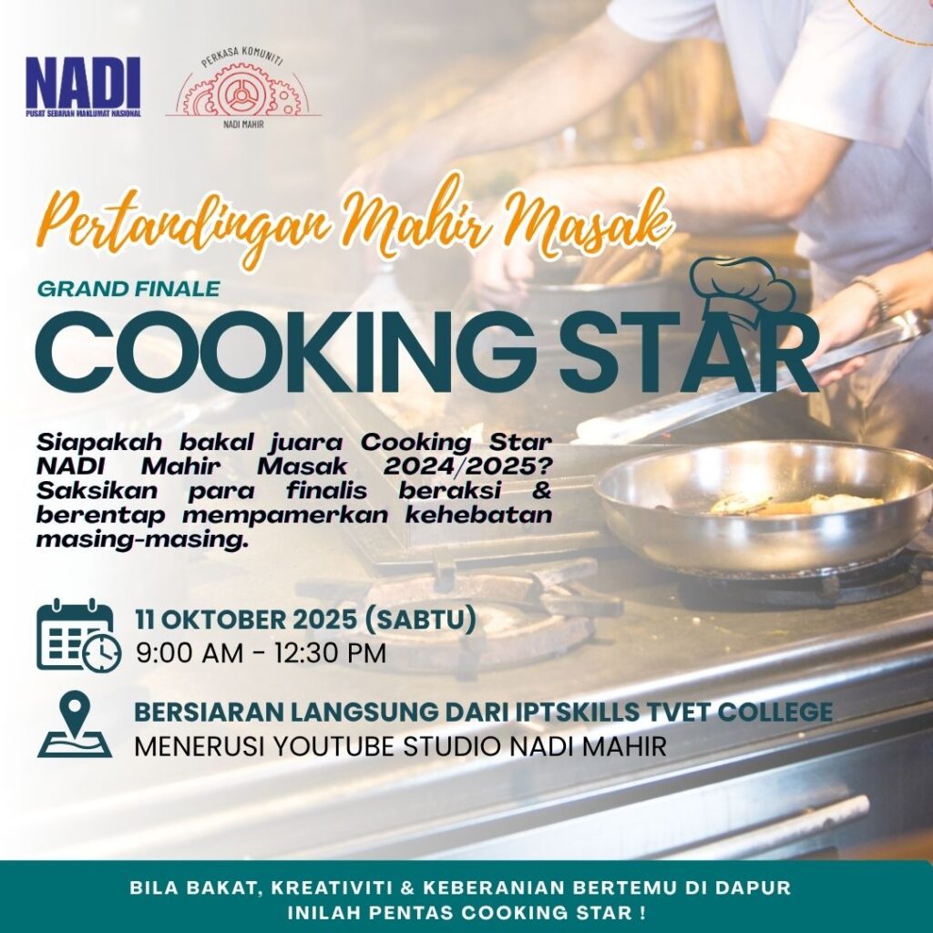 Pertandingan Cooking Star kini tiba ke peringkat akhir! Saksikan peserta terbaik beraksi secara LIVE dari IPTSKILLS TVET COLLEGE menerusi youtube Studio NADI Mahir ! 🎥👩🏻🍳